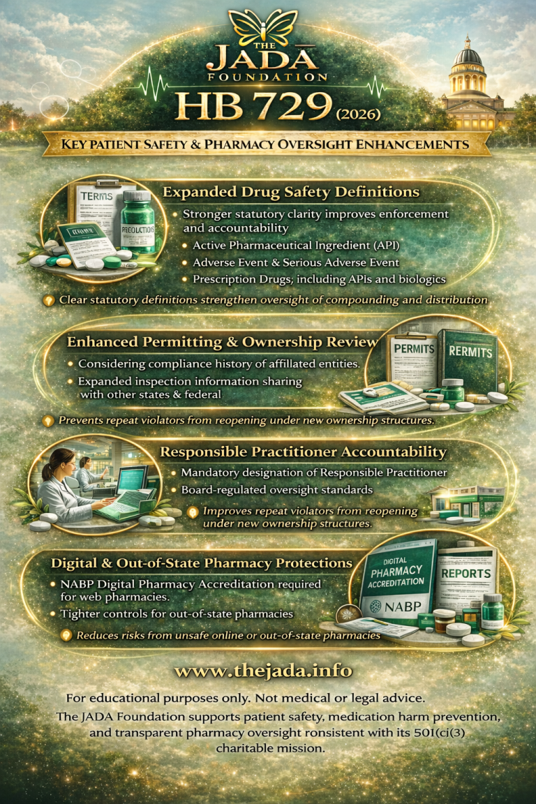 Jimmie’s Law is The JADA Foundation’s public safety initiative dedicated to strengthening medication safety, pharmacy accountability, and patient protection through education and responsible legislative engagement